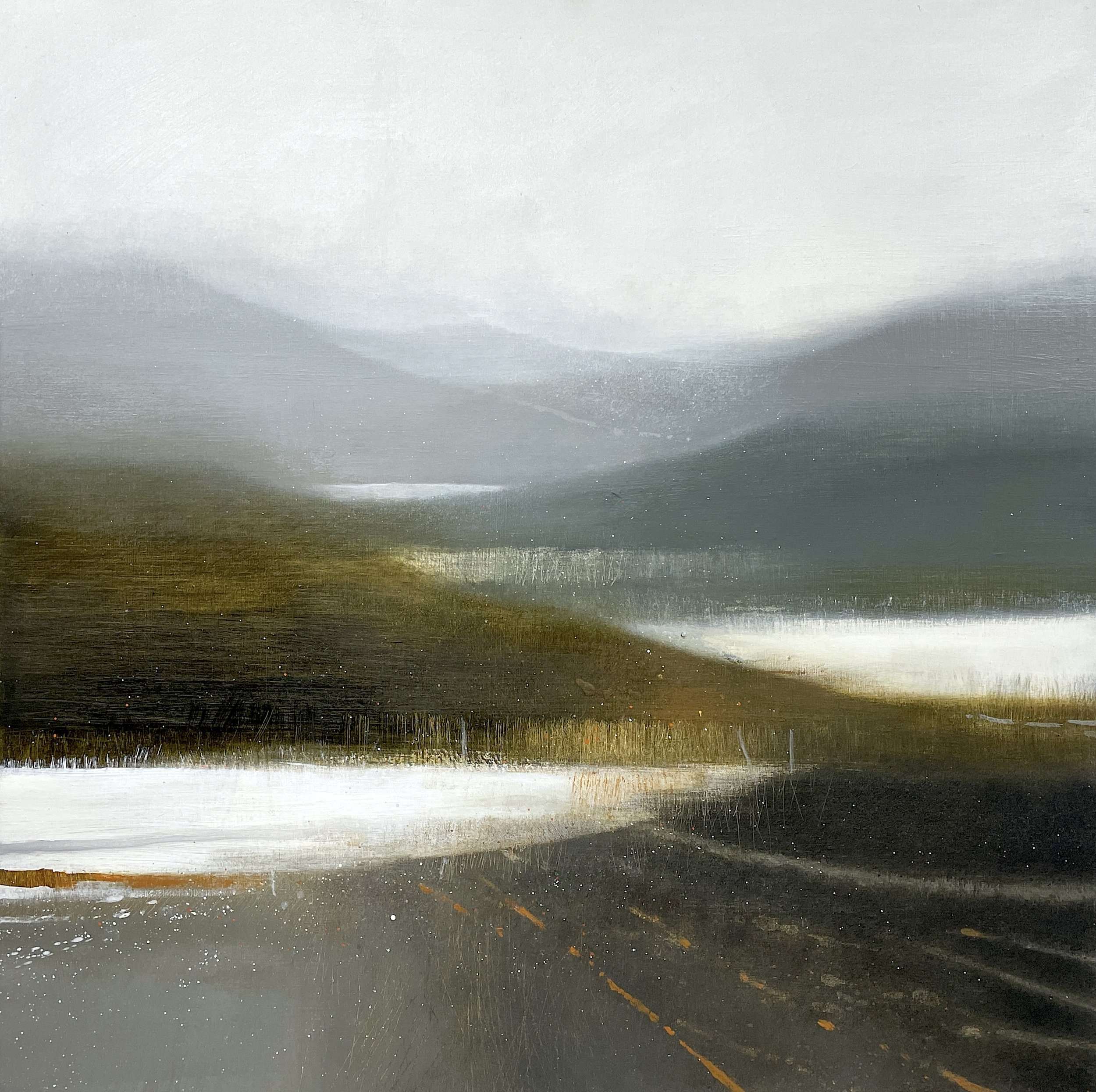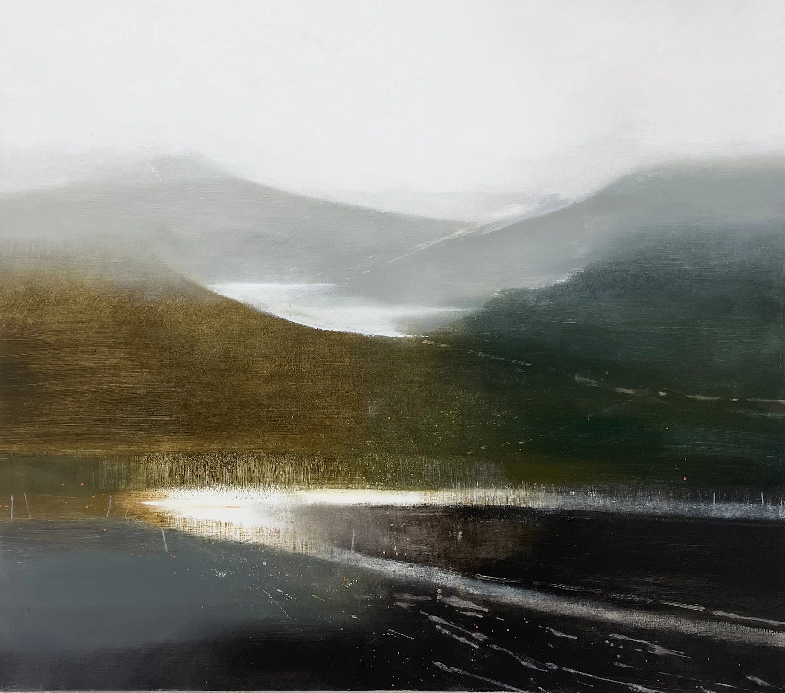 Paintings inspired by the sanctuary of Winter, white skies, mountains over lakes, wild and secret places. The space where the water meets the earth, shorelines, lakesides and rivers…